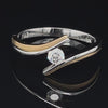 This uniquely designed womens diamond ring 0.15 carats in total weight is crafted in 10K yellow and white gold with high polish edges and sand blast finish. This solitaire wave engagement ring hosts a big round diamond embelish the center to add to glitter. Solitaire connects the two sides and sits on top of the shoulders to give it a rich and stunning look.
