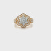This 14k yellow and white gold flower head ring is hand crafted with 1.39 carat in total. The center is set with a large diamond surrounded with additional diamonds accents set on a flower-shaped with halo setting diamonds to add to brilliance. The shoulders of the ring host two rows of diamonds in a channel set which creates an exquisite look.