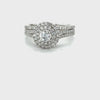14K White Gold 1.00TDW Diamond Double Round Halo Wedding Set. This stunning double halo engagement ring has a split shank design with a classic matching band to complete the ensemble. Just like the two of you, this diamond bridal set is the perfect pair. On your wedding day, the coordinating diamond wedding band completes this elegant ensemble. Radiant with diamonds, this bridal set is finished with a bright polished shine.