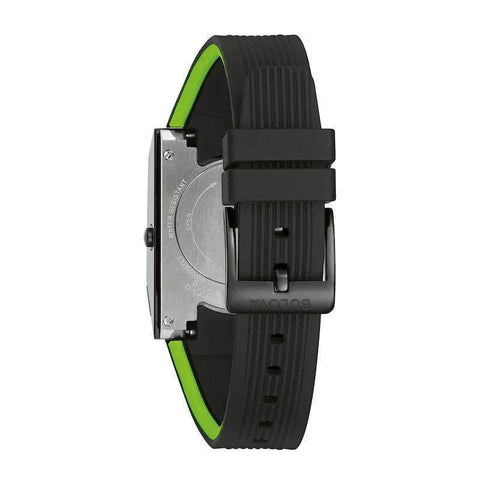 This D-Cave from Bulova is a classic men's watch boldly embellished with retro styling. The 32mm black stainless steel case houses an exposed skeleton dial, showcasing the circuitry inside the watch.. The watch includes a flat mineral crystal, push-button fold-over clasp with safety, features a kinetically powered movement, and water resistance upto 30 meters.
