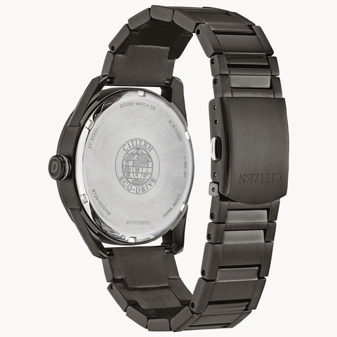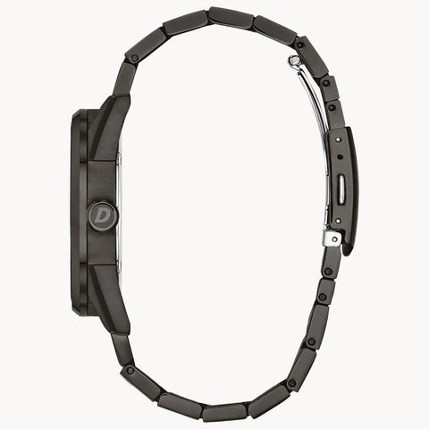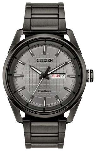 Drive from Citizen Eco-Drive round gray ion plated stainless steelcase and bracelet, gray dial, domed crystal, day/date, 42mm case, WR100, buckle.