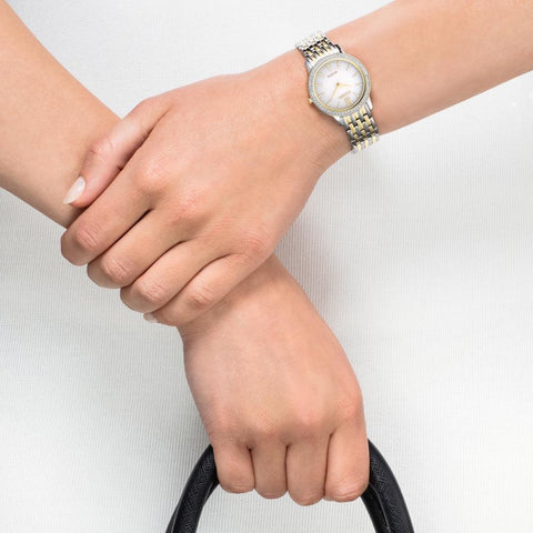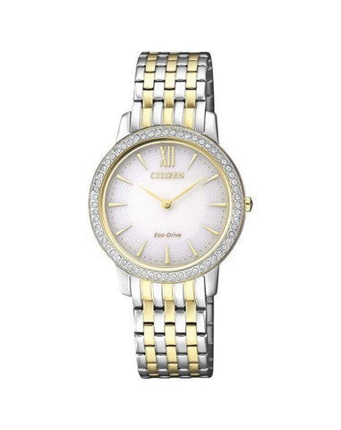 Citizen Eco-Drive round two-tone stainless steel case and bracelet, white dial, Swarovski crystal accents, SC, 29mm case, WR50, fold over clasp with push button.