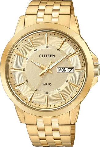 Citizen Quartz round gold-tone stainless steel case and bracelet, champagne dial with gold accents, day/date, 41mm case, WR50, fold over clasp with push button.